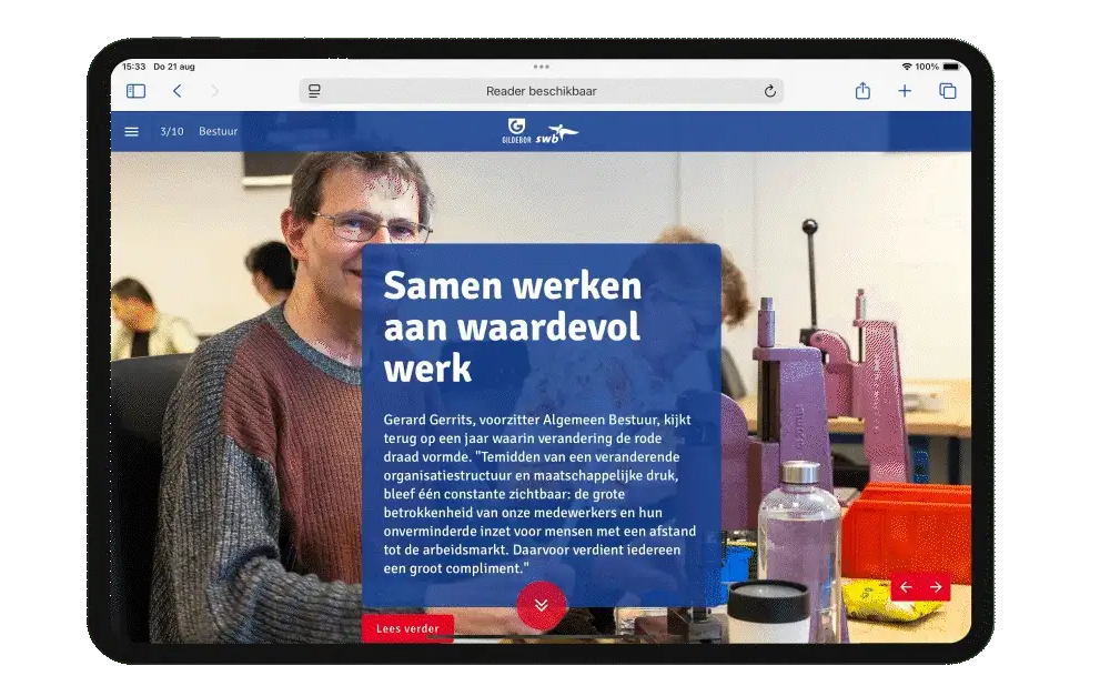 Zorgorganisatie SWB meldde zich bij ons voor een interactief jaarverslag. Een verplichte publicatie, zonder dat het zo overkomt. Met volop ruimte voor de mensen achter de organisatie. Dus beleving creëren vanuit storytelling – laat dat nu net ons credo zijn!