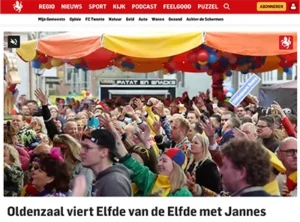 Ondanks dat 11 november op een dinsdag viel dit jaar, kwamen ruim 3.000 feestvierders naar de binnenstad van Oldenzaal om alles mee te maken. Op het programma stond onder andere een optreden van volkszanger Jannes, een elfkroegentocht en het Twents leedkesfestival. Genoeg redenen voor regionale en lokale media om niet alleen de opening met de bokprocessie en het woordje van de burgemeester af te wachten, maar om ook aangehaakt te blijven voor de rest van de dag. Bekijk hier het kranteninterview met onze directeur Laurens Oude Elberink over de Twentse 11e van de 11e, voorafgaand aan het evenement.